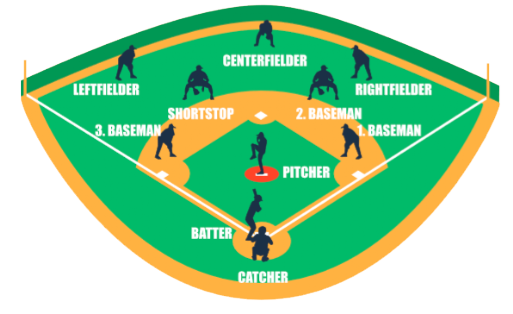 In einem Baseballspiel stehen sich zwei Mannschaften zu je neun Spielern gegenüber. Gespielt wird auf einem Feld, das etwa einem Viertelkreis entspricht und eine Kantenlänge von ca. 100 Metern hat.